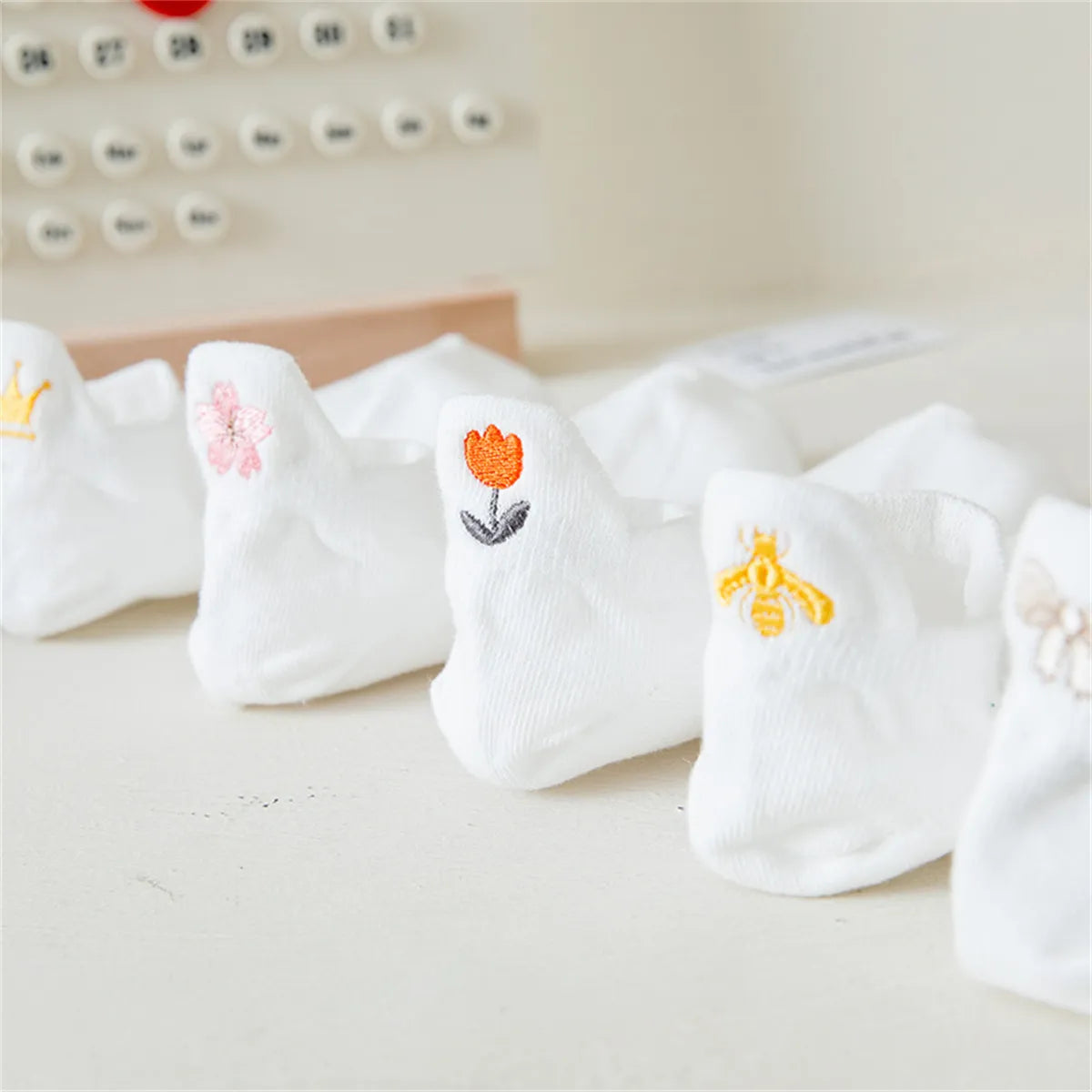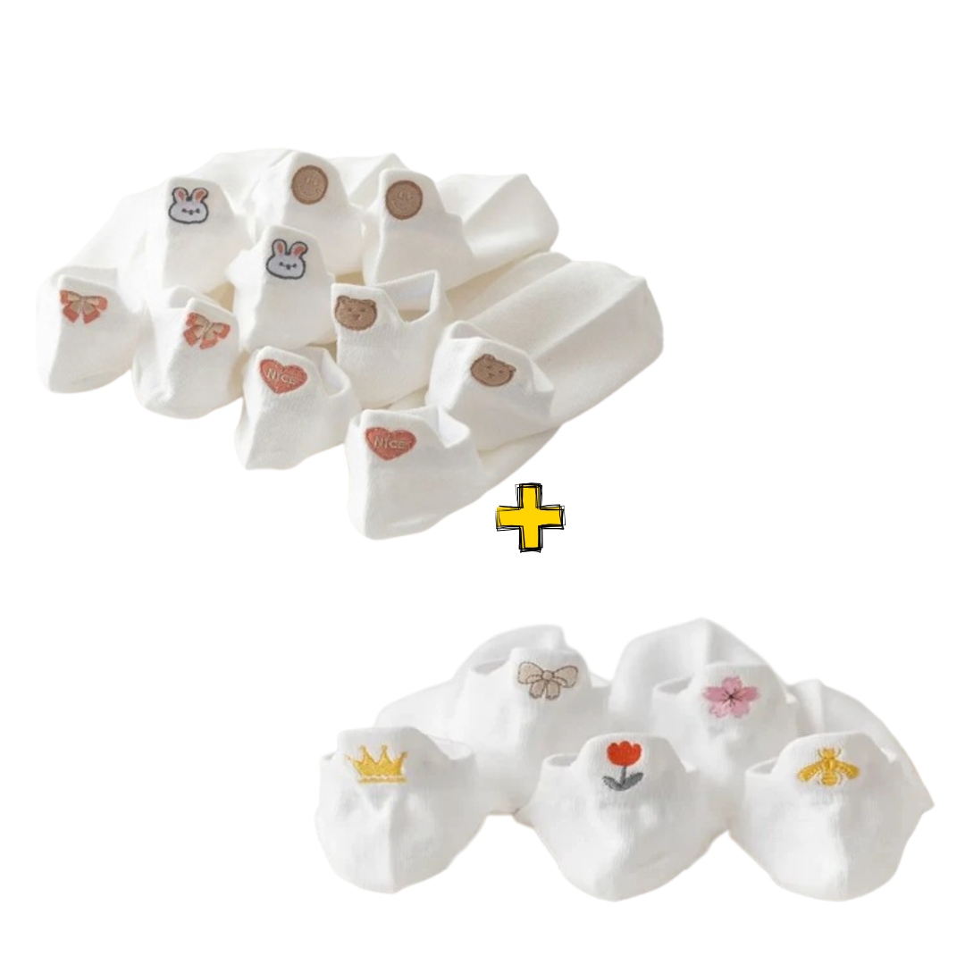 Meias brancas com proteção no calcanhar, kit com 5 pares com diferentes bordados