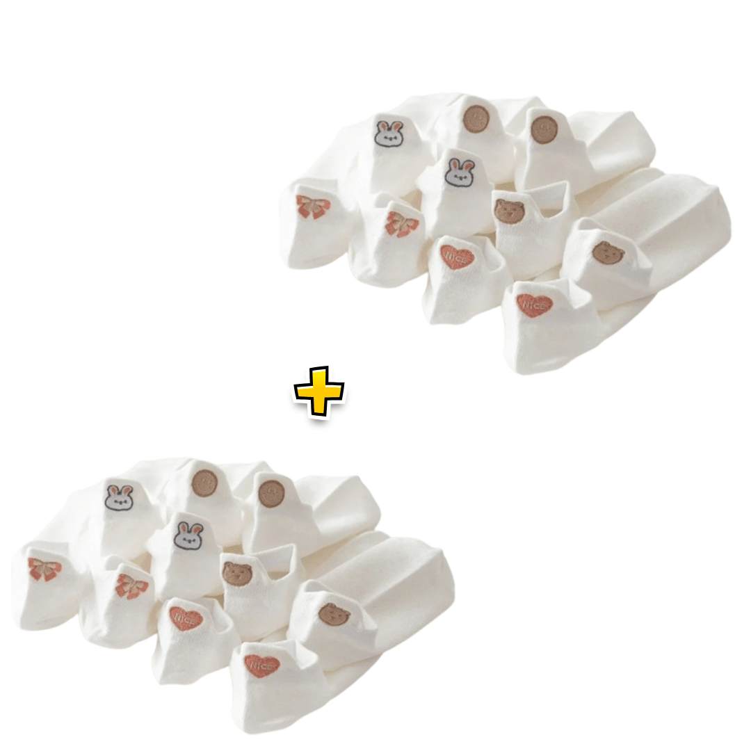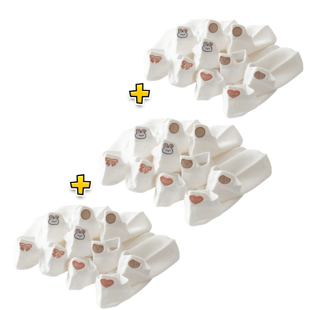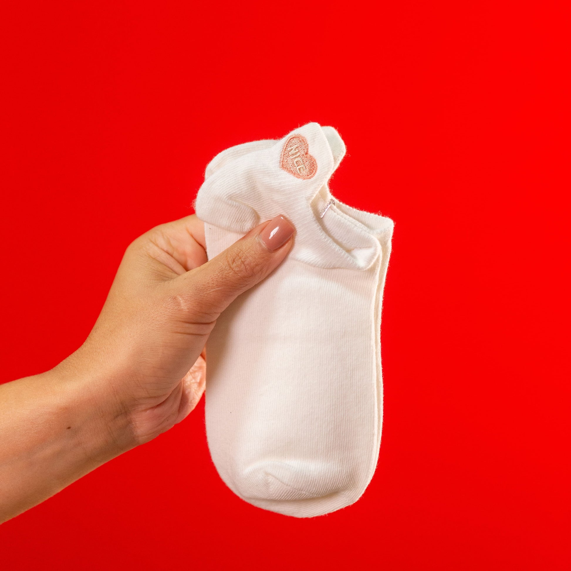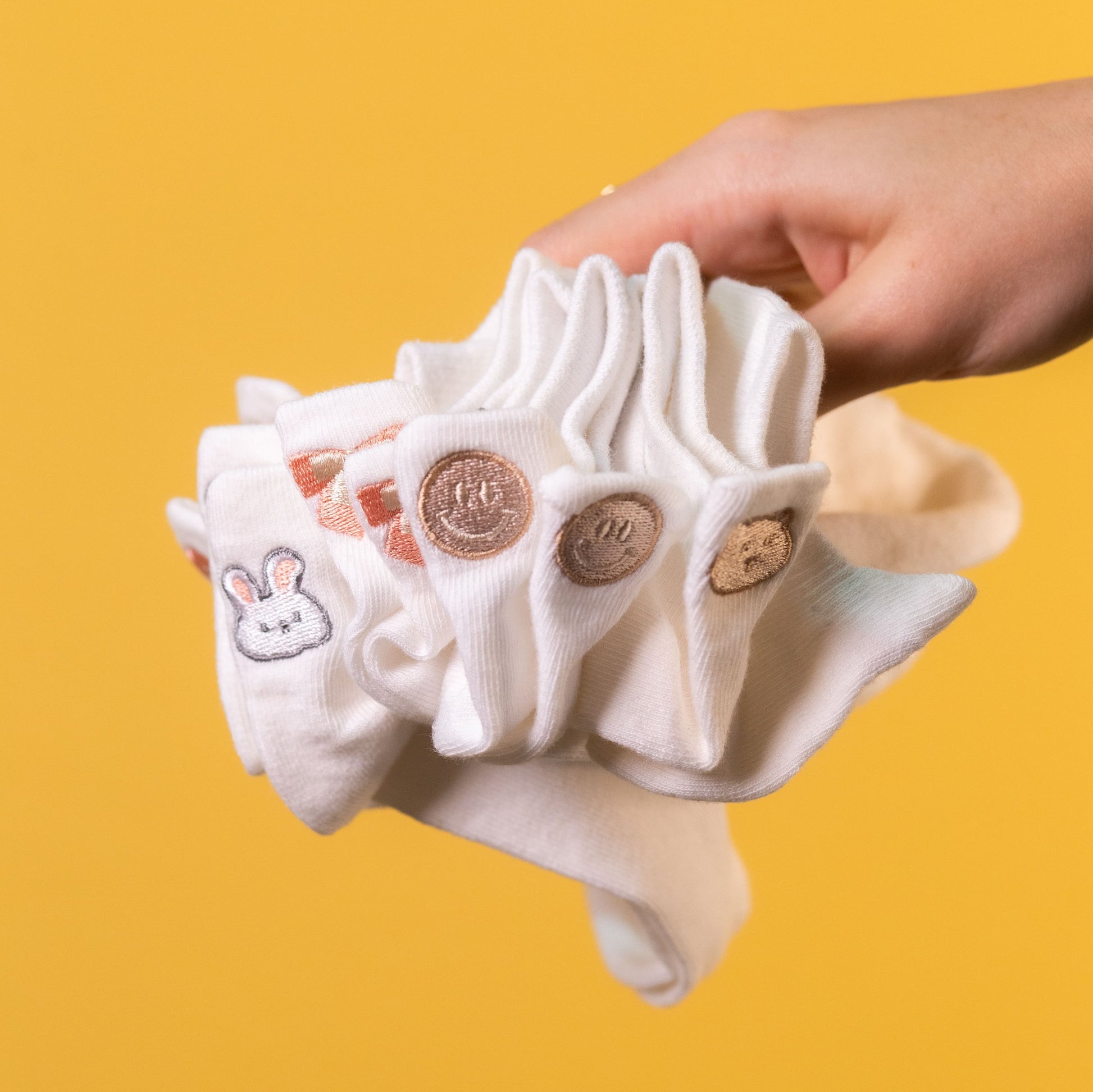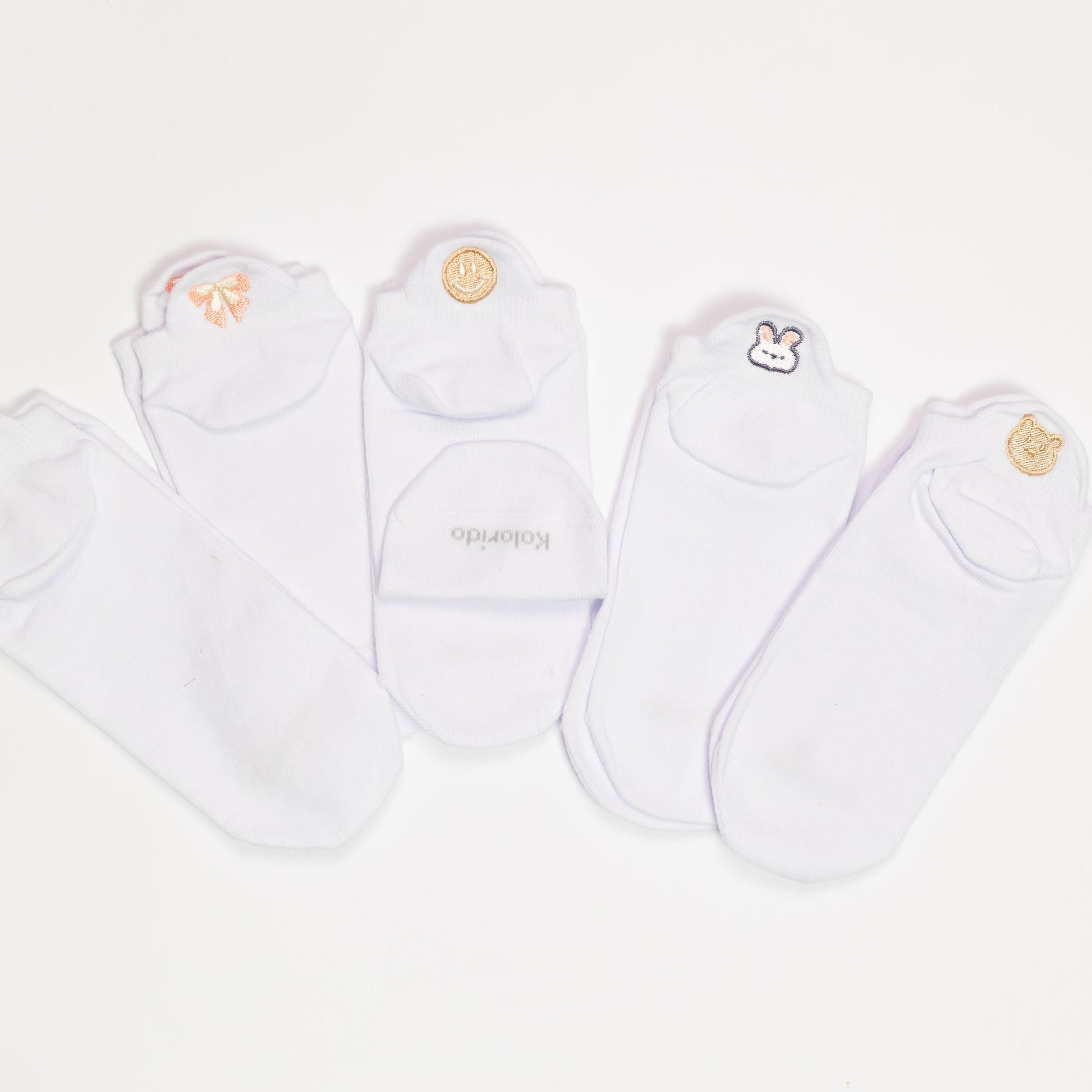 Meias brancas com proteção no calcanhar, kit com 5 pares com diferentes bordados