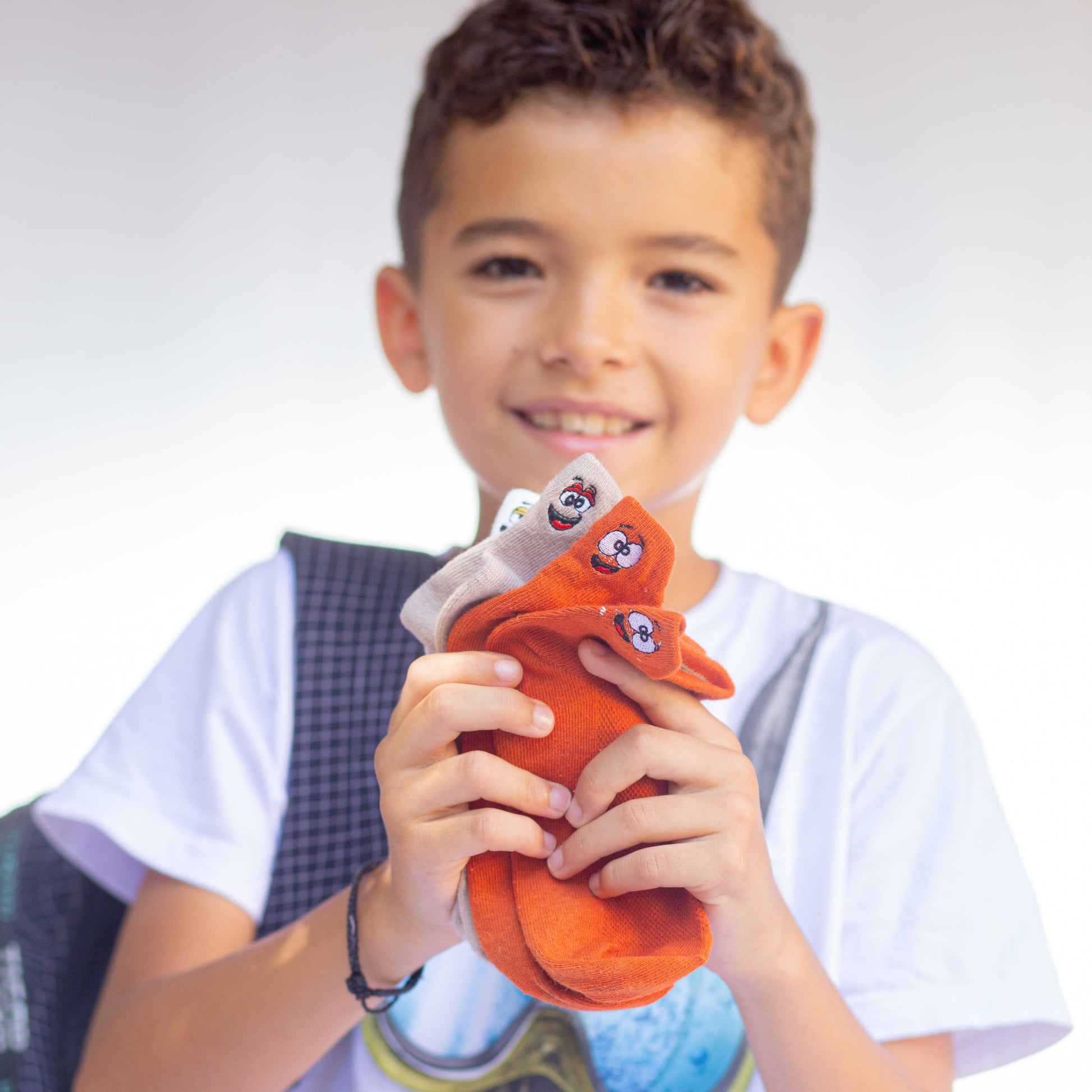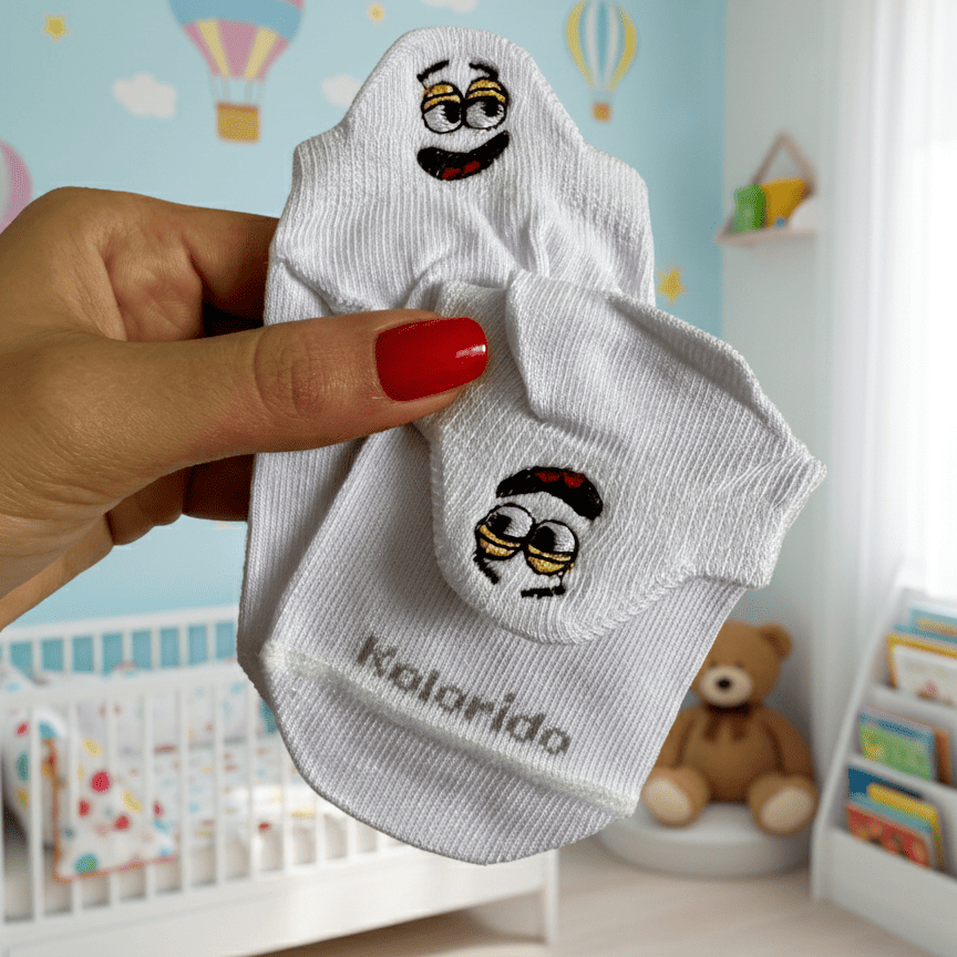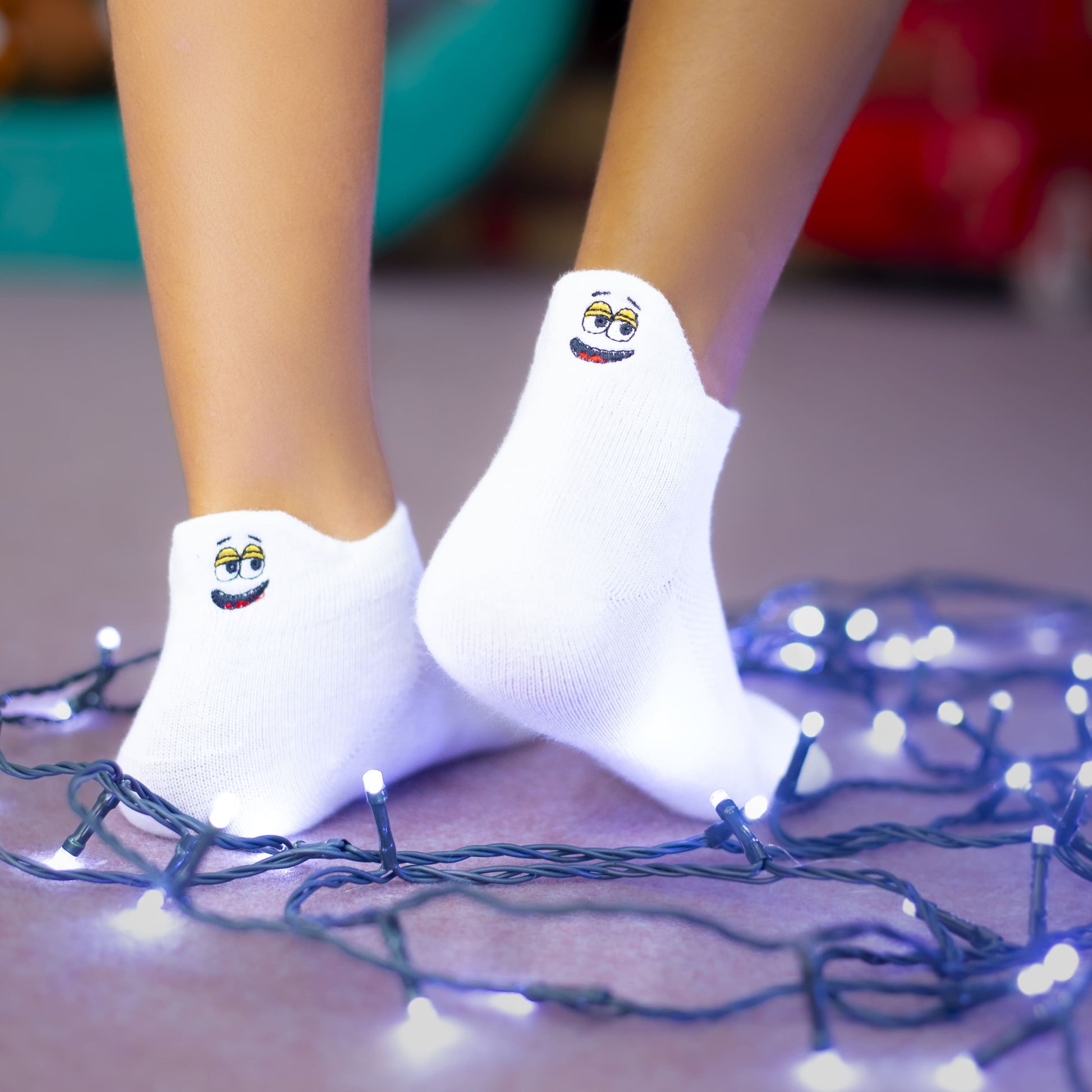 Meias brancas com proteção no calcanhar, kit com 5 pares com diferentes bordados